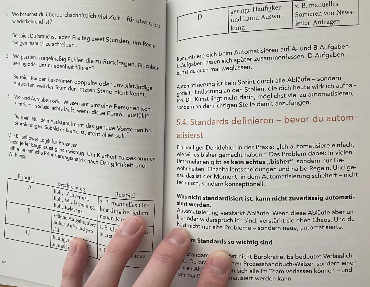 Individuelle Abläufe wirken oft wie unüberwindbare Hürden. Das Buch zeigt dir, wie du Standards definierst, Prozesse sichtbar machst und so auch komplexe Abläufe für Automatisierung öffnest.